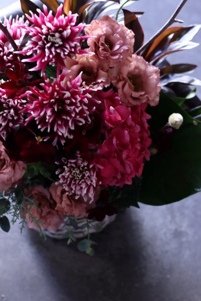 美しいグラデーションのマムを使用したアレンジメント。こちらのマムは、なかなか入荷はありませんが、参考までに・・・