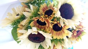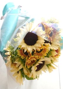 今回は ひまわり ホワイトナイトとサンリッチライチという品種で花束をつくりました