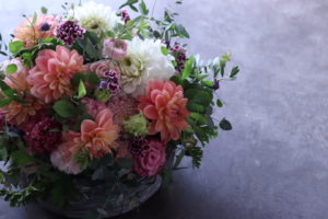 華やかなダリアとやわらかいラナンキュラスとトルコキキョウ