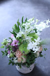 ご家族のかたが少しでも気持ちが癒されるようにと、白を基調にした淡い色合いのお花をお作りしています。