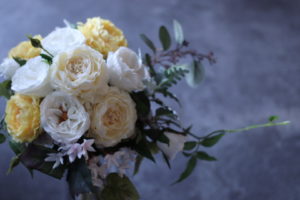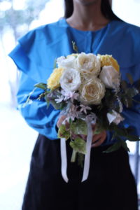 今回はブルーのドレスに合わせる黄色系の造花のブーケをお作りしました。