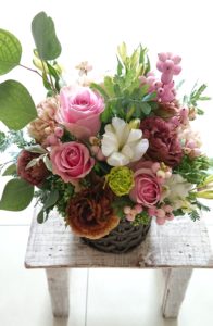 手前に入っているお花はトルコキキョウ。アーバンダブルショコラという色。